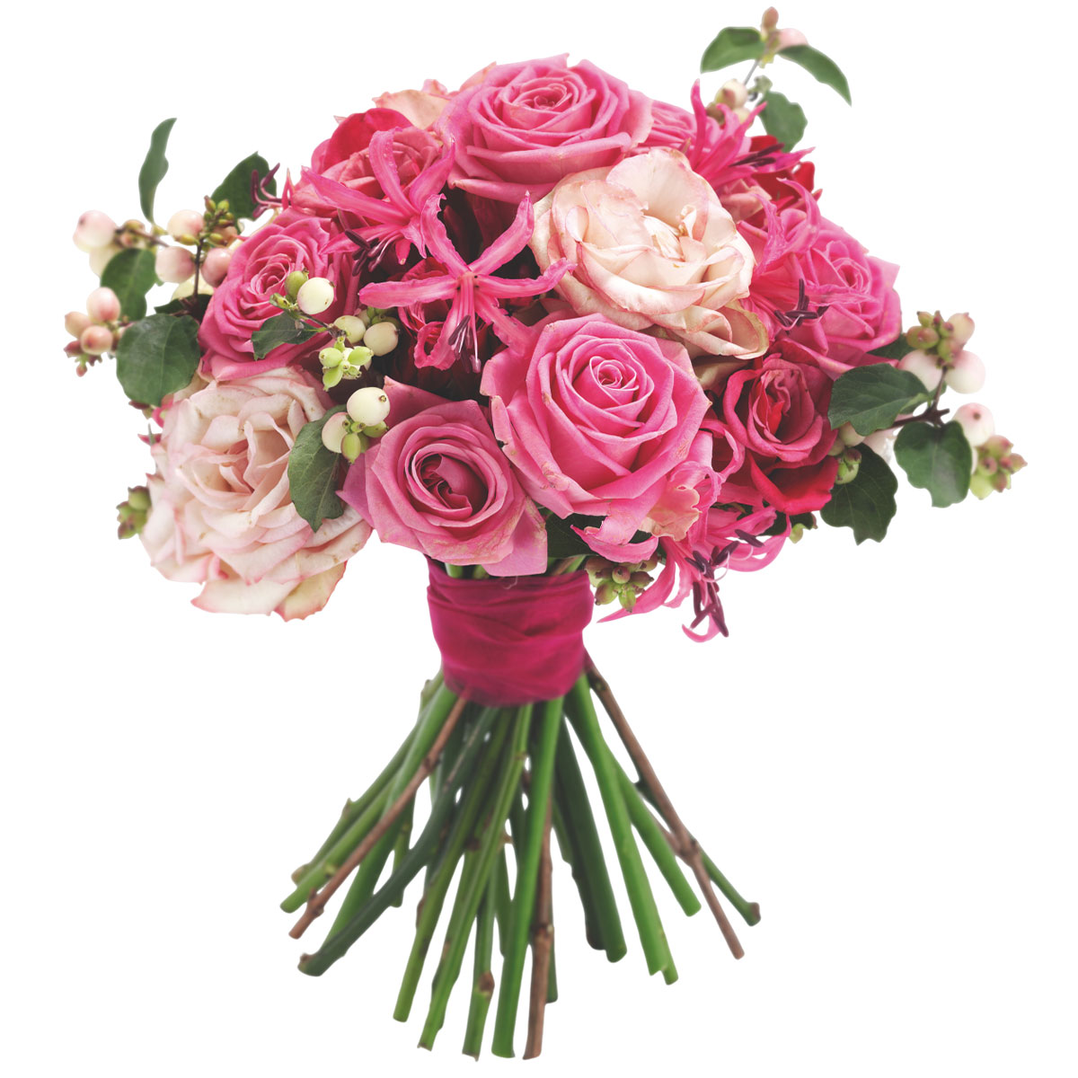 Роза одноголовая белая и розовая, снежноягодник, нерина розовая. Упаковка (лента, пленка, крафт, сетка, пленка матовая)