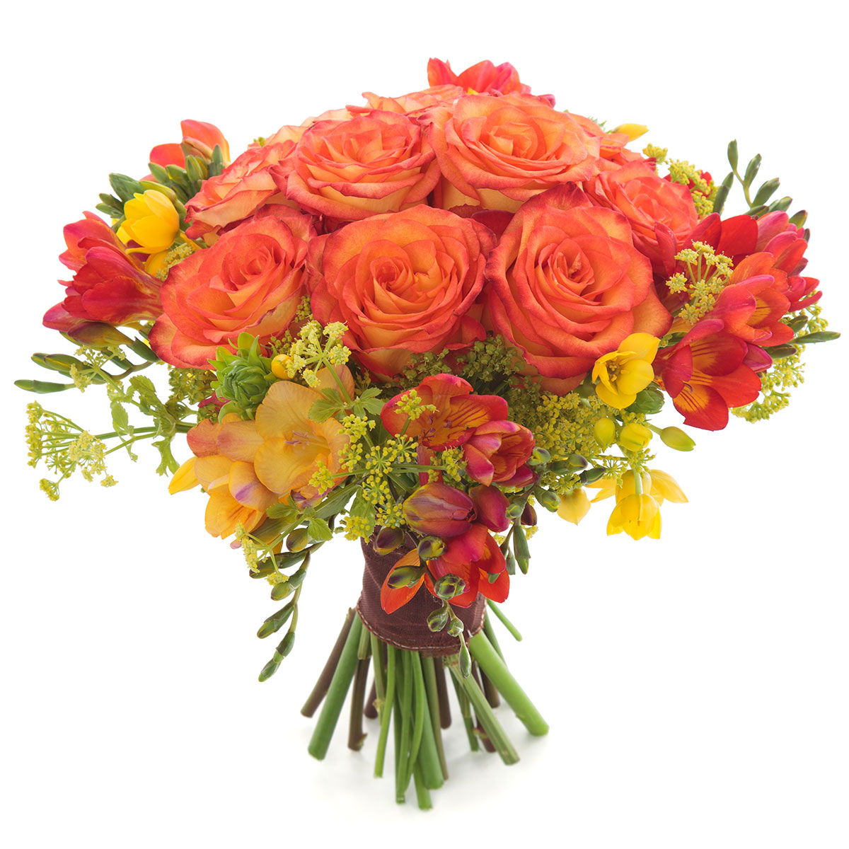 Роза одноголовая оранжевая, фрезия желтая и оранжевая, фенхель. Упаковка (лента, пленка, крафт, сетка, пленка матовая)