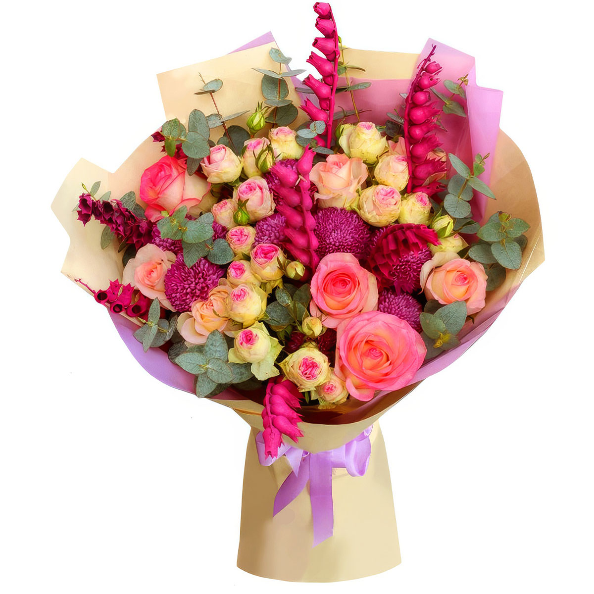 Роза кустовая пионовидная кремовая, роза одноголовая розовая, астра розовая, львиный зев, эвкалипт. Упаковка (лента, пленка, крафт, сетка, пленка матовая)