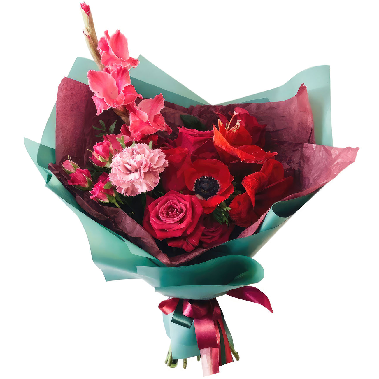 Амариллис, анемон красный, роза одноголовая красная, роза кустовая розовая, гвоздика розовая, гладиолус розовый. Упаковка (лента, пленка, крафт, сетка, пленка матовая)