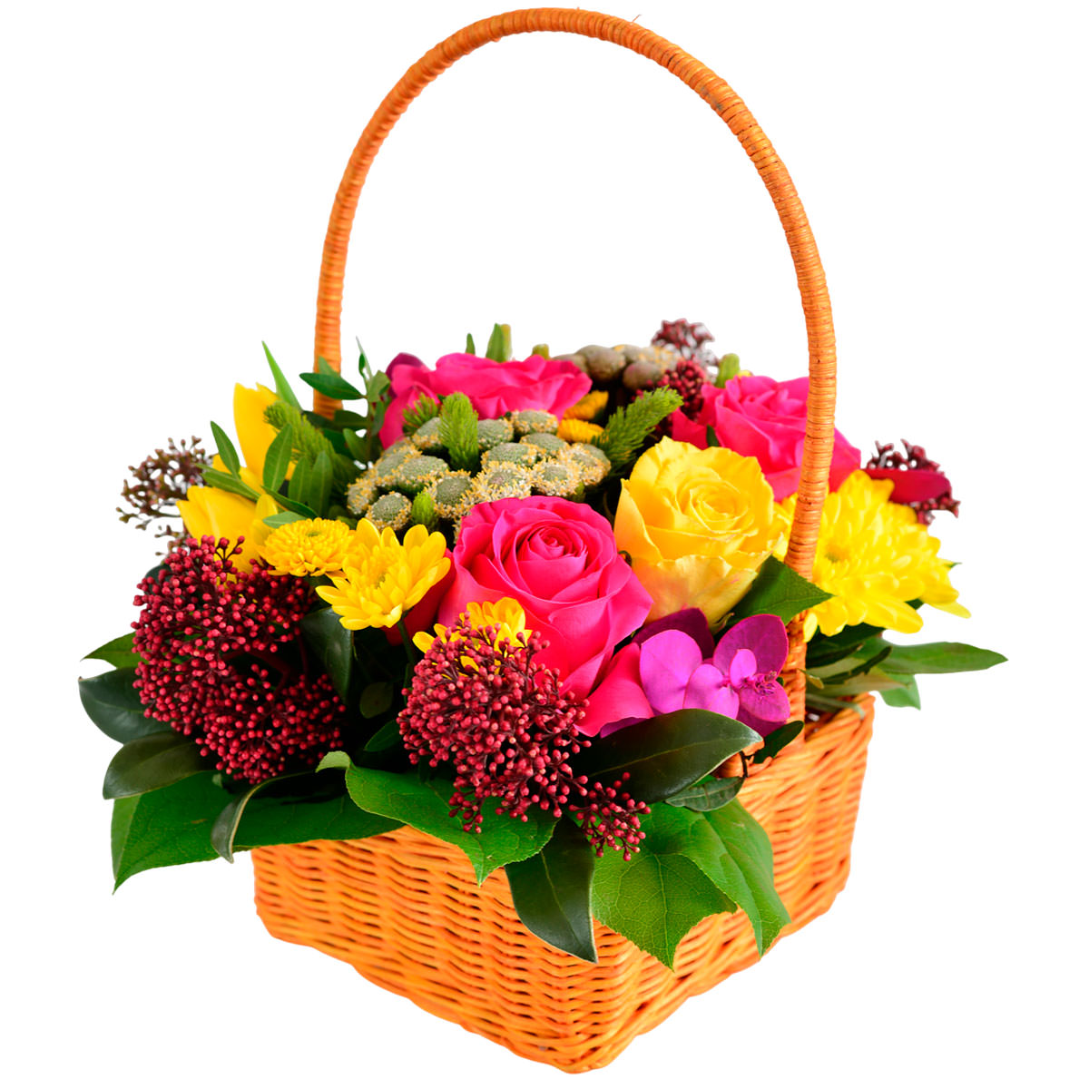 Роза одноголовая розовая и желтая, хризантема кустовая желтая, скимия, эвкалипт. Упаковка (Корзина, оазис, ящик).