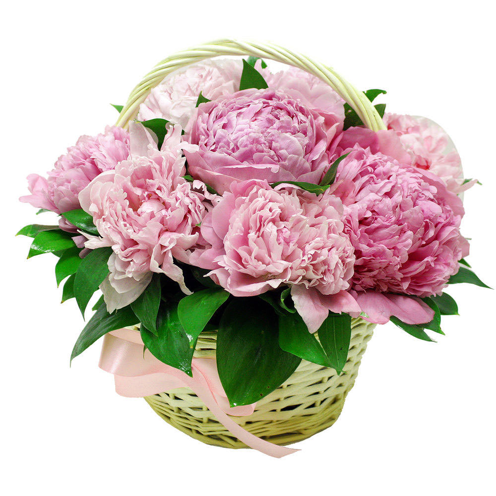 Пион розовый, зелень. Упаковка (Корзина, оазис).